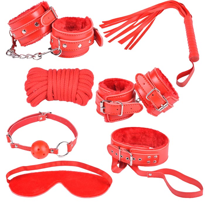 Bộ đồ chơi bạo dâm cực kỳ vui nhộn và hấp dẫn bao gồm: bịt mắt, khóa cằm, khóa cổ, roi, khóa chân, khóa tay (hoặc bộ khóa chân tay có thể tháo rời), bàn chải lông vũ, dây đeo vai, kẹp ngực….